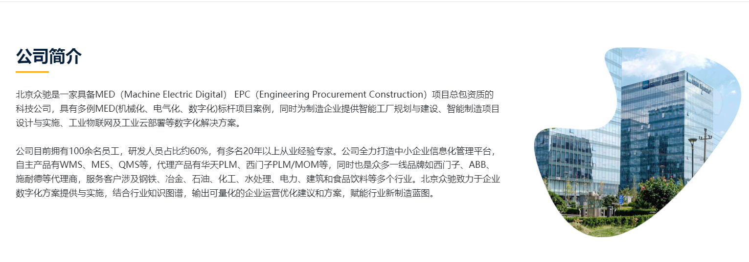 北京众驰是一家具备MED(Machine Electric Digital) EPC(Engineering Procurement Construction)项目总包资质的科技公司,具有多例MED(机械化、电气化、数字化)标杆项目案例,同时为制造企业提供智能工厂规划与建设、智能制造项目设计与实施、工业物联网及工业云部署等数字化解决方案。公司目前拥有100余名员工,研发人员占比约60%,有多名20年以上从业经验专家。公司全力打造中小企业信息化管理平台,自主产品有WMS、MES、QMS等,代理产品有华天PLM、西门子PLM/MOM等,同时也是众多一线品牌如西门子、ABB、施耐德等的一级代理商,服务客户涉及钢铁、冶金、石油、化工、水处理、电力、建筑和食品饮料等多个行业。北京众驰致力于企业数字化方案提供与实施,结合行业知识图谱,输出可量化的企业运营优化建议和方案,赋能行业新制造蓝图。